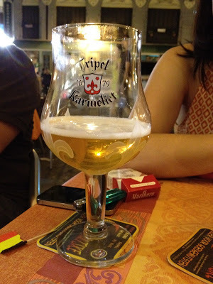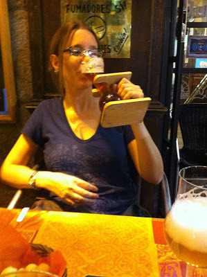 Jorge, who was born in Mexico, now lives in Madrid, and once lived in Belgium, tells me that each Belgian beer is served in its own particular kind of glass. This tasty Tripel Karmeliet, for example, has this lovely fleur-de-lis glass.