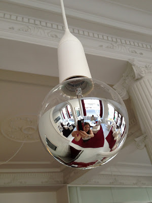 take a photo of us in the reflected light bulbs.
