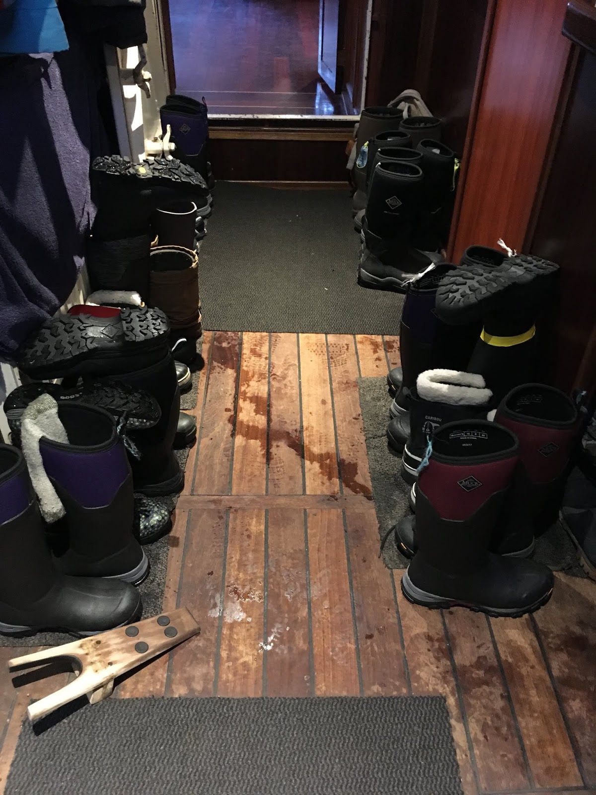First thing you encounter is the Very Narrow Corridor With Too Many Boots. In the picture below, it is way more tidy than normal. We didn't wear our outside shoes inside the Antigua, so every time you stepped in or out, you did the awkward and time-consuming boot-transition thing.