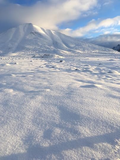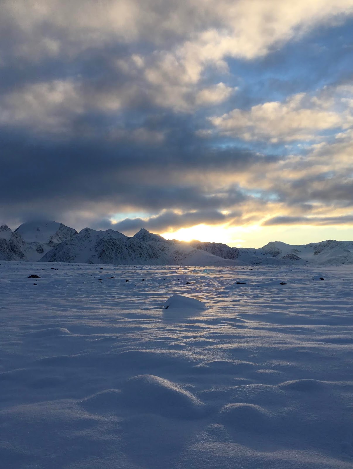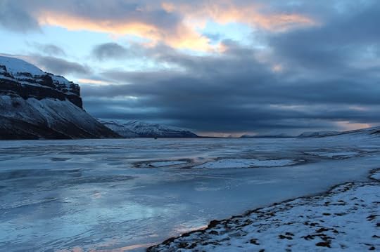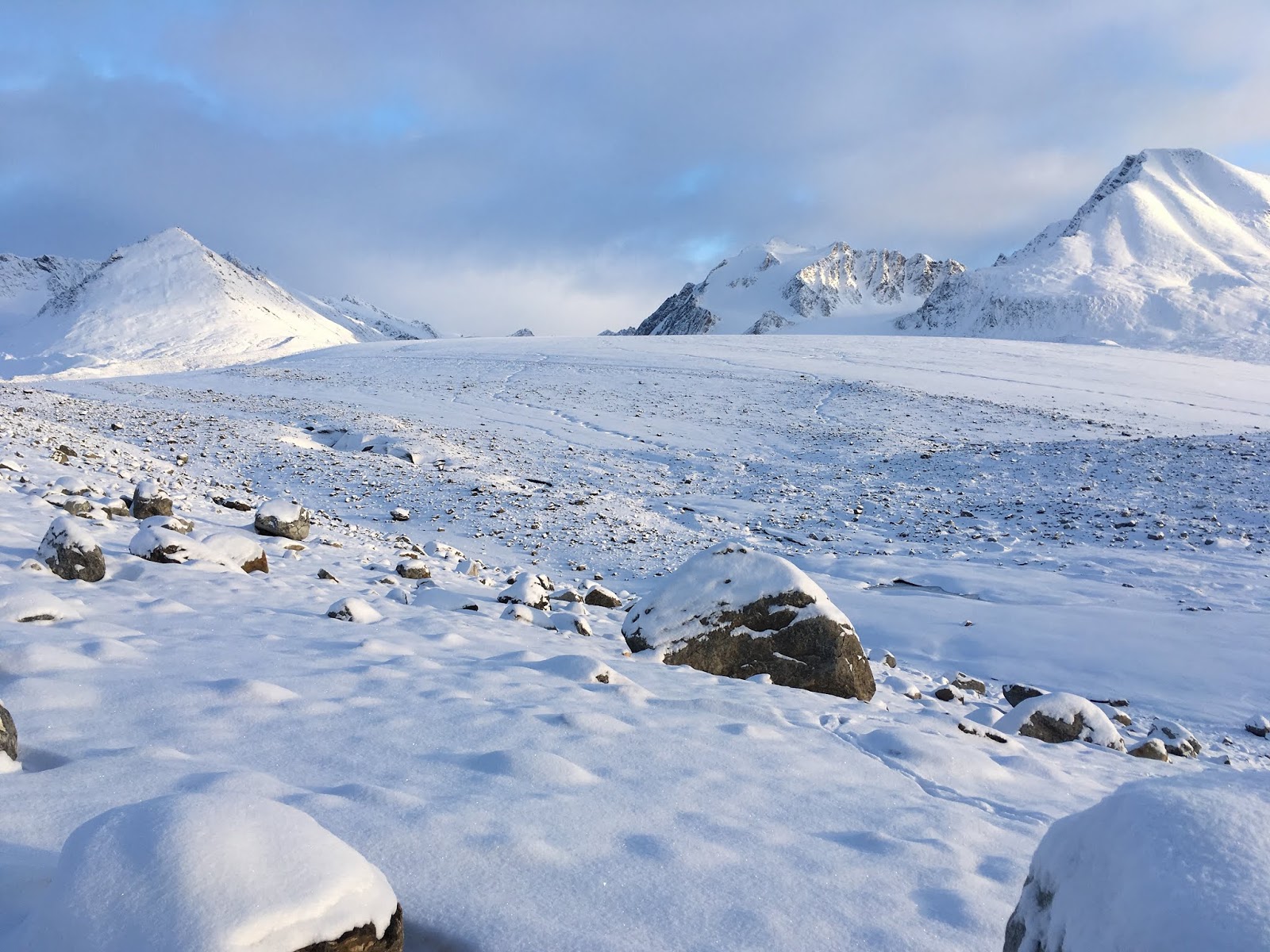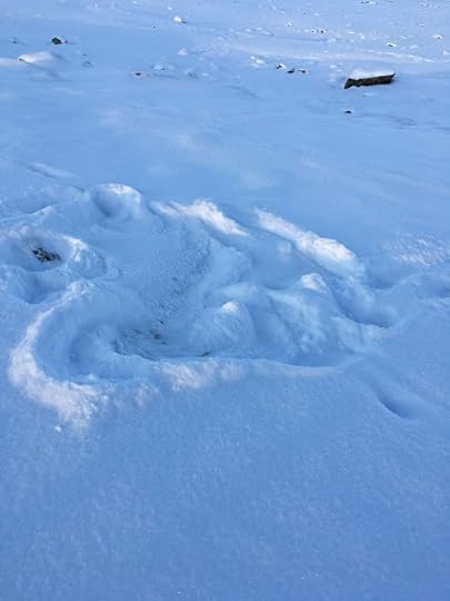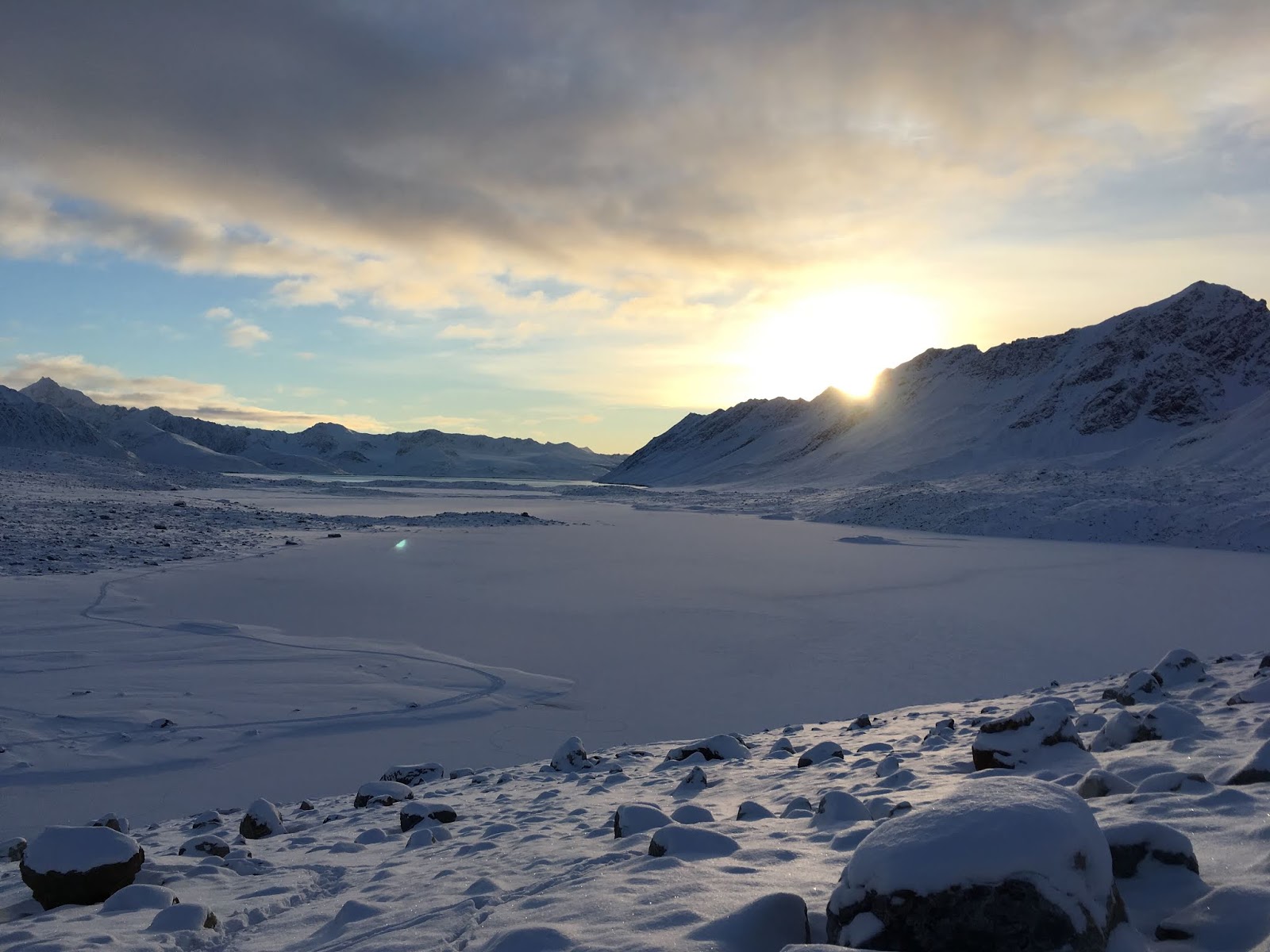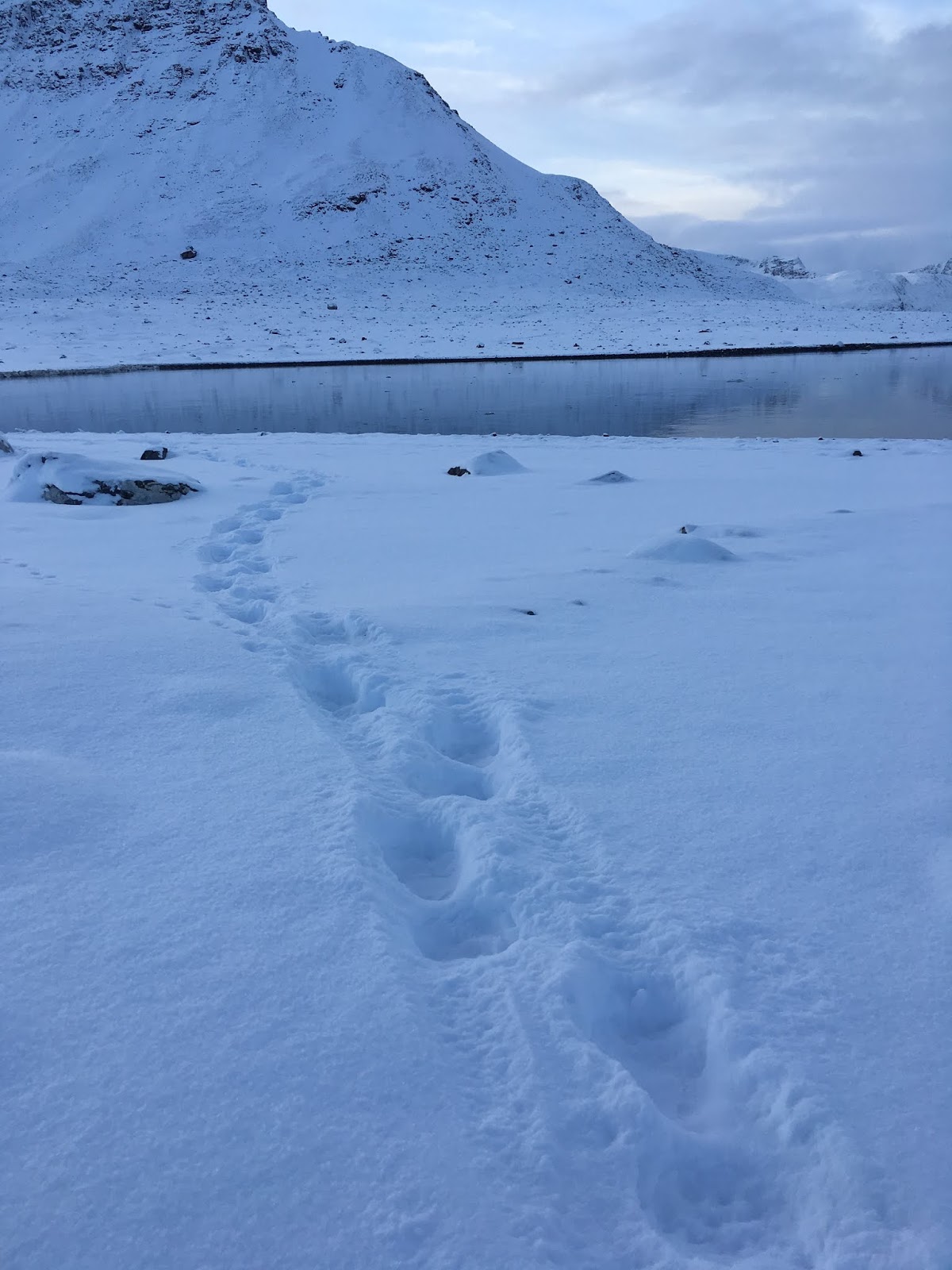Our path skirted the frozen edges of two beautiful lakes, this one crossed with the tracks of an Arctic fox.