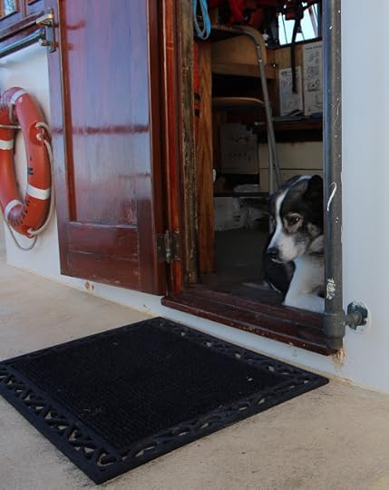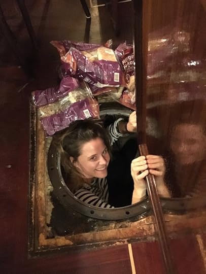 This is Janine climbing into a hole in the floor of the lounge, under some of the seats, to retrieve some of the food. Everything under your feet in a ship is a storage space, an outlet to the water system, or something!