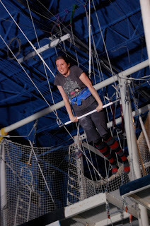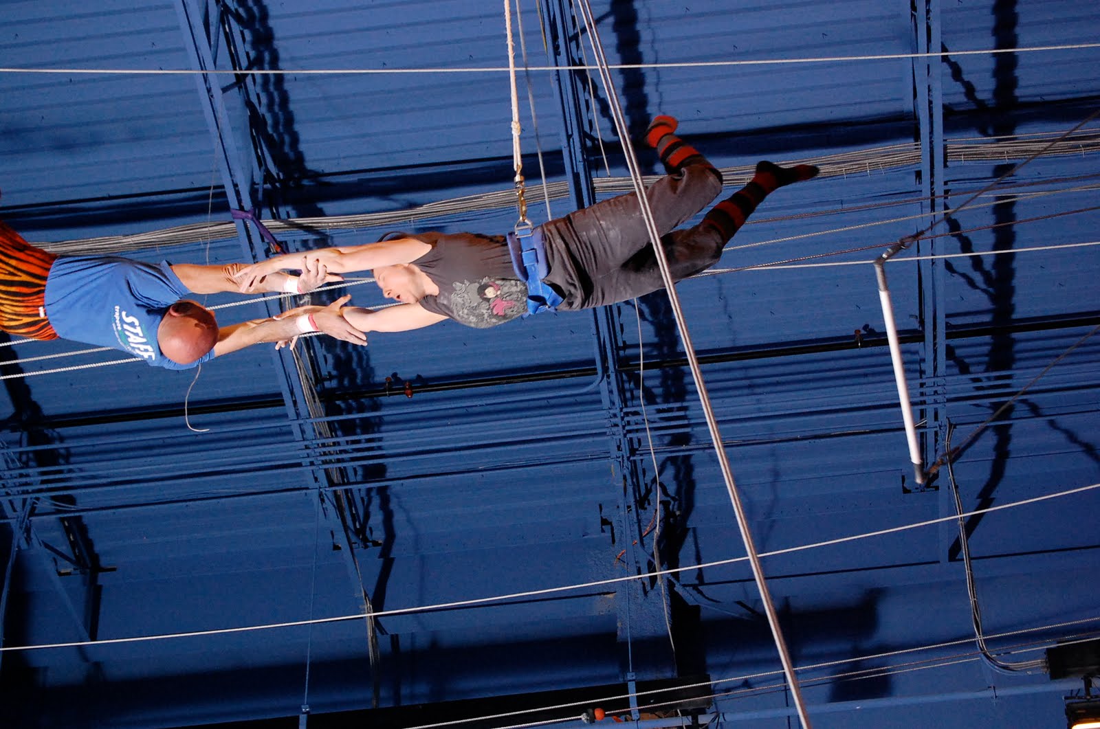 Now, to give credit where credit is due, I don't think it's exaggerating to say that the person on lines at this time (Kaz) was providing most of the muscle. It was the end of a hard class and I was EXHAUSTED. Also, the catcher (John F) is a superstar for seeing this wild, floppy thing flying toward him and managing to catch it anyway. After he caught me, I was so COMPLETELY SHOCKED at having made the catch that I forgot everything I was supposed to do next and probably made his job rather difficult. ALSO, a thank you to the person on the board as I was taking off (Wendy), who said something to me that at the time I thought was nuts: "Sometimes, when it's your first time trying to catch something, that's all your body needs to know -- that it's catch time -- in order to figure out what to do." I was skeptical, but as it happens, this catch was the first time I ever managed to get into position in time for this trick. THANK YOU, Wendy, Kaz, and John at TSNY Beantown! Amy, thanks for the excellent company, and Molly, a big thank you for the pictures!