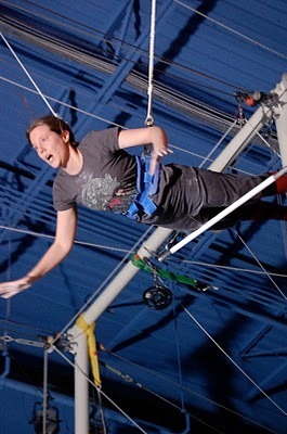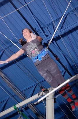 Alternately, you do a pathetic little motion with your arms that might be mistaken, in ignorant circles, as a mid-air push-up, then let the guy on lines muscle you up into the hands of your catcher. This is not recommended. Regrettably, sometimes, it's all you're capable of. :o) (Explanation: the person "on lines" is the person holding your halter lines and breaking any falls so that you don't break your neck. The halter lines are connected to your belt. When you're first learning a trick and/or if you don't have the strength yet to lift yourself into all the necessary positions, the person on lines often uses his/her strength to pull the lines and help lift you.)