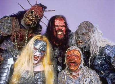 If you like cellos and Metallica and wonder where my sister, secret codename: Apocalyptica, got her codename from, watch out for these guys. (Another music video.) (Also, I'm guessing that even people who *don't* like Metallica [like my Dad] would like that.) (Also, I'm pleased to see that they dress warmly when appropriate. It is Finland, after all.) (Y'all know how much I love Finland, right?) My dad once sent me and codename: Cordelia a postcard from Finland that had a picture of the Finnish heavy metal band Lordi on the front. In it, he claimed to be well on the way to starting a new career in rock. If you knew Lordi and if you knew my Dad (whose career, for his entire professional life, was as a professor of religion), you would appreciate how funny this is. As a visual aid, here's Lordi: