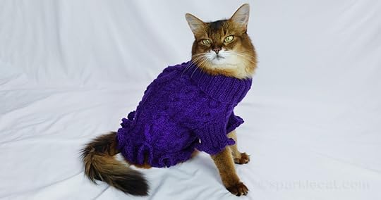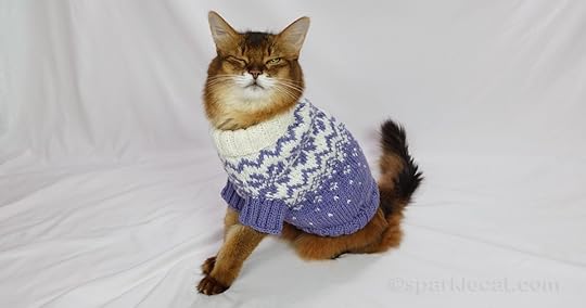 About two and a half months ago, a nice Instagram follower from Finland asked for my measurements so she could knit me a sweater. So my human sent them along. A few weeks later, they were coming to the U.S. for a visit and sent me a package during their trip. It turned out to be not one but two sweaters! And they are amazing, cozy and so well made. Unfortunately we are having a heat wave here, but let’s face it, they are too pretty to wait for winter. So my human cranked up the air conditioning, and I got to model them.