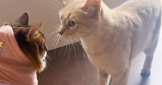 During one of my visits with the peach kitty, my human captured a series of photos of us just hanging out in the doorway of the enclosed patio. You’ve seen one or two of them, but I thought you’d enjoy seeing the sequence of photos. No secret comments because they’re not necessary.