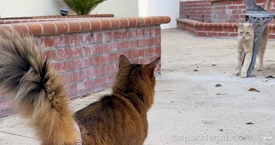 During our visit, my human hugged me and petted me a lot in front of the peach kitty. She wants him to see how I enjoy my human putting her hands on me. And during our treat session, he came up to her hand while she was petting me. He was probably wondering if she had any treats, but he didn’t run off immediately when my human gently grazed his face with the backs of her fingers. Feral cats don’t like their faces being touched, so my human is trying to ease him into that.