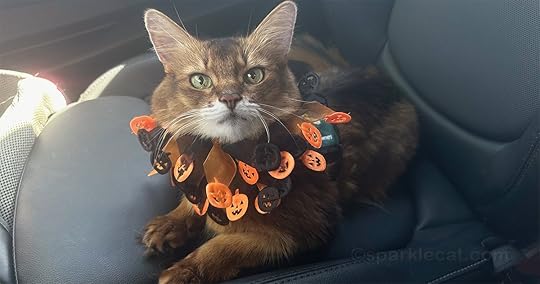 I got to visit the assisted living residence this week, and I wore my festive Halloween collar. I began my therapy cat work the moment my human signed us in at the front. An older lady — we didn’t know if she was a resident or visitor — started petting me right away. There was also one of my friends who doesn’t recognize me anymore wandering through. She did stop to pet me, but she seemed like she was in another world.