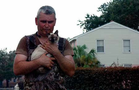 Not only do humans in the Armed forces receive healing from cats, we cats also receive help from them. Not always in a foreign land either. The sergeant below is rescuing a cat during the aftermath of Hurricane Katrina.