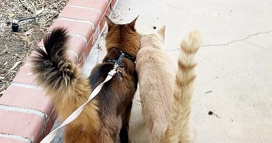 My human has been keeping me indoors too, even though she always scans the area we’ll be hanging out before bringing me outside. She figures if the ferals don’t think it’s safe to be out and about, I’m not either. Which is why I got to have a visit with the peach kitty this week. She saw him and his other family members on the security cam for a few nights in a row. And no coyotes. So after scanning the area by our bridge, she took me out. And the peach kitty showed up.