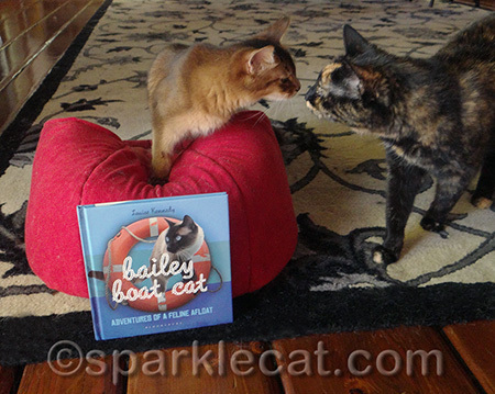 This is my first giveaway on the blog and I’m so excited! A couple of months ago, Sparkle wound up with an extra copy of her friend Bailey’s book, Bailey Boat Cat. She never got the chance to give it away, so now I get to. But first I’m going to sneak up on it!