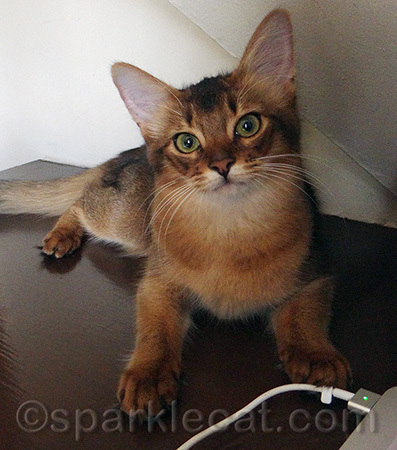 So I guess you want to know more about me since I’ve inherited Sparkle’s blog. My full name is Tajhara Summer Samba, but I want you to know I am not as snooty as my name! I’m just a regular, everyday 5-month-old kitten who happens to compete in cat shows (I’ve done three so far) and who is in training to become a therapy cat. I’m very outgoing and I love people and new experiences. Well, I guess that doesn’t sound very regular! But I do play with things I’m not supposed to (my new human had to move her stash of plastic bags out of my reach), and I get crazy a few times a day — and that’s pretty regular, right?