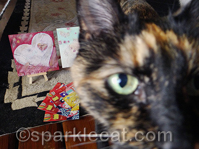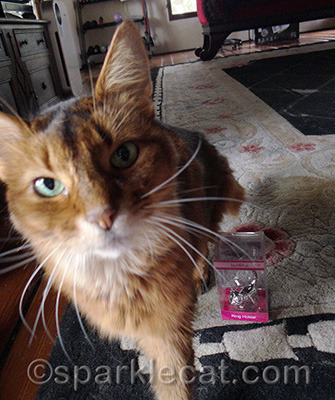 When my human bought the Valentine’s Day cards, she also bought this little metal kitty ring holder for herself… and then realized she didn’t need it! Her rings already have a place where they go, and this little cat would get lost on her big dresser. So she said I could give it away to one of my readers.
