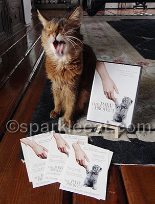 First up, the Paw Project! As you might recall, during November and December, I vowed to donate all royalties I received from my No Declaw tote bag to this awesome organization, which has the goal of educating humans about how awful it is to declaw cats, and to encourage them to outlaw declawing. My goal was to sell 20 totes, and I wound up selling 14 for a total of $20.07 in royalties. My human rounded that up to $25 and sent it in, not realizing that currently, with a minimum donation, they will send you a copy of the Paw Project DVD! My human was really surprised when it arrived in the mail. Since declawing is already illegal in Los Angeles, my human wanted to send the DVD to someone who could use it. It turned out that somebody she knows in Seattle had recently seen the movie and was fired up to do work towards outlawing declawing up there, so she sent the DVD to them.