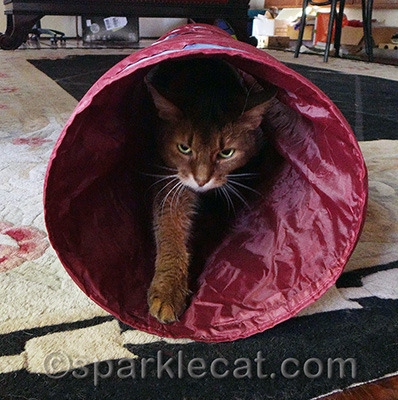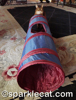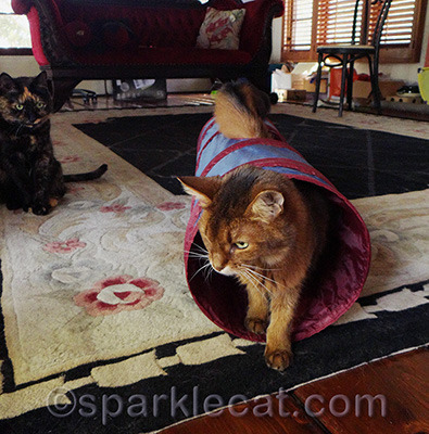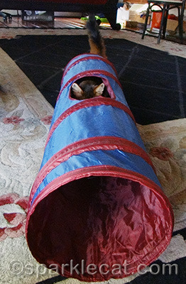 Although nearly all of the residents at Tabby’s Place are adoptable, the humans there sort of assumed that Tashi would be there always. Then, two years ago, a miracle happened and Tashi found a home. I was maybe less surprised than the humans because I knew with his strong spirit and great personality, his disability could never hold him back. And he wound up with an amazing family. They also adopted Gabriella, a kitty with sever cerebellar hyperplasia, and later on, they adopted Dot, another Tabby’s Place resident, who has spina bifida.