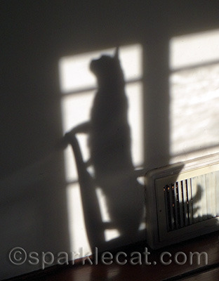 It turned out she was right. Her friend had even been planning to go to the Humane Society in search of kitties that weekend. But she went to see this kitty instead — and wound up adopting her! The photo above is Cassie (her new name) the first weekend in her new home. My human’s friend adores her “pre-owned” kitty and her personality even reminds her a little of Muffin.