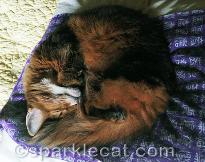 Somali cats like me are closely related to Abyssinians, and I am (very) distantly related to a certain celebrity Aby named Jacoby who lives in Boston and is a therapy cat. In fact, he was honored as Cat of the Year at the Westchester Cat Show in November! You can find out more about Jake and other Abys at The Daily Abyssinian blog — in fact, if you ever want an Aby of your own, there are frequently posts about Abys needing rescue! (Oh yes, it happens to purebreds all too often.) You will find Jake’s handsome, award-winning self in several fetching poses at the Daily Abyssinian Zazzle shop — plus some of the other members of his family, past and present too.