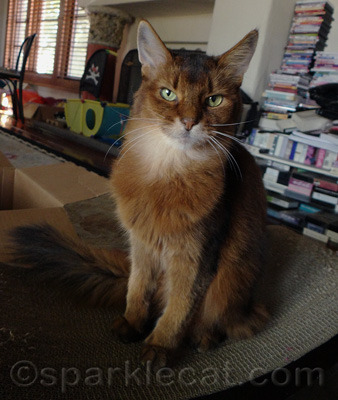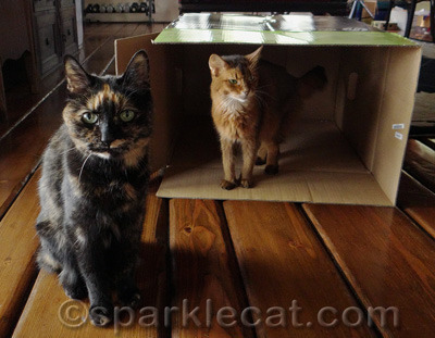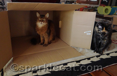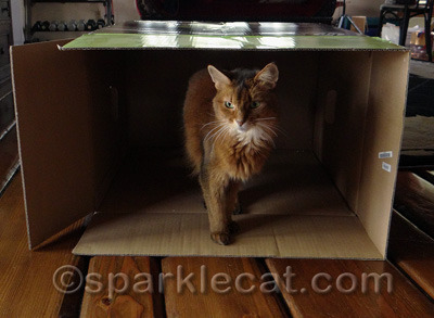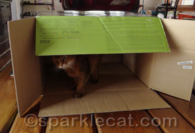 But even though it is a big box, that does not mean that there is room for more than one kitty! Binga wants in, but I told her she needed to give me the password.
