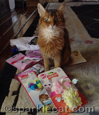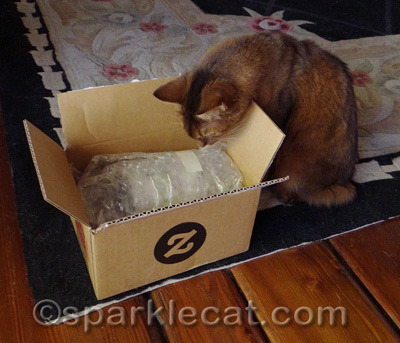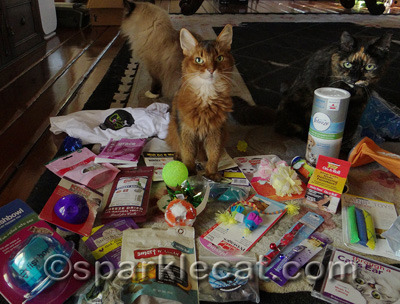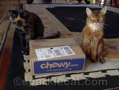 I was happy to see I got a new shipment from Chewy.com! I was not happy to see Binga horning her way into my photo shoot.