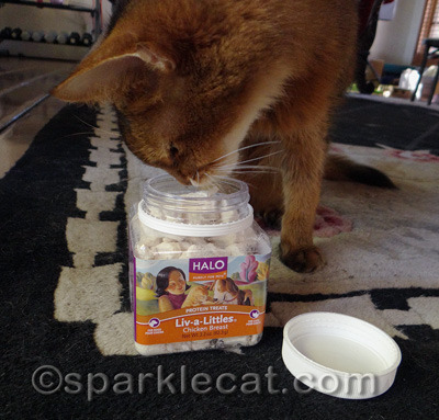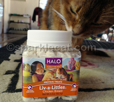 It is a container of one of my favorite treats, Halo Liv-a-Littles Chicken Breast treats! These were the first freeze-dried chicken treats I ever had, years ago! So you can imagine how excited I was when Chewy.com offered to send me some to try out! I immediately said yes because I already knew I was going to like them!