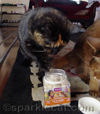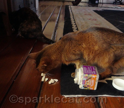 Yes, there was a little mishap. Can you see Binga? She stole some treats and she is trying to hide.
