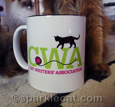 It’s a Cat Writers’ Association mug! I am a cat and a writer, so it was clearly meant for me.