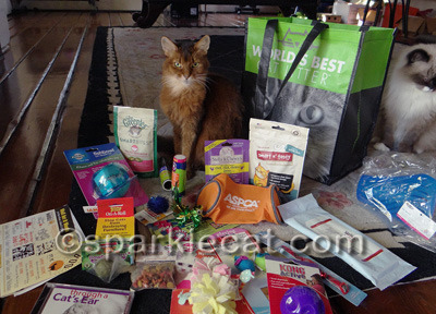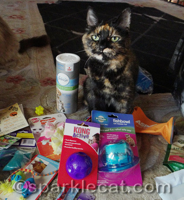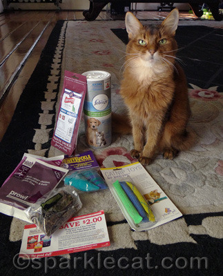 This is what I decided to give away keep! It’s actually a respectable assortment of treats and toys. I got to keep the Stella and Chewy’s coupon because I let the sample bag go into the giveaway. I don’t know why my human kept the Febreze Pet Odor Eliminator… it must be because of the dog since we kitties always smell awesome!