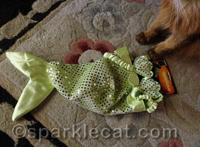 But then things took a turn for the worse. Halloween is still a whole month off and my human has already been bringing home some unspeakable horrors. We thought she was done after the Carmen Miranda debacle but no. She came back from PetCo a while back with this: