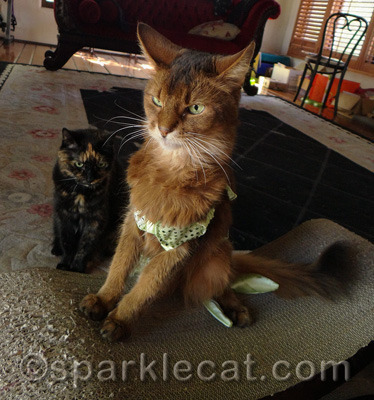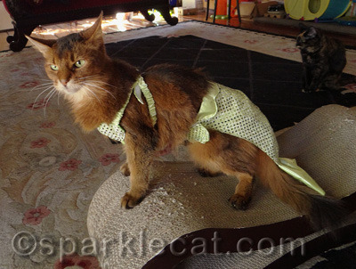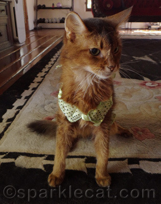 Fortunately for me, it was one size fits all, which always means its too big for me. Binga, not-so-fortunately for her, is a perfectly average-sized cat. One size always fits her.