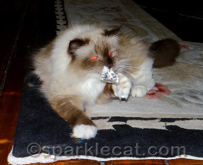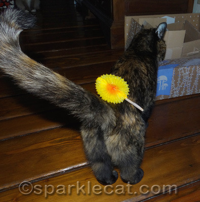 A friend of the humans came to visit and he did not think much of tortie cats. He said she looked like a “tore-up kitty,” and Binga bit him on the nose! Her favorite game as a kitten was to wake up the humans by attacking their faces. Eventually she outgrew that. But she has never outgrown believing that the rules do not apply to her.