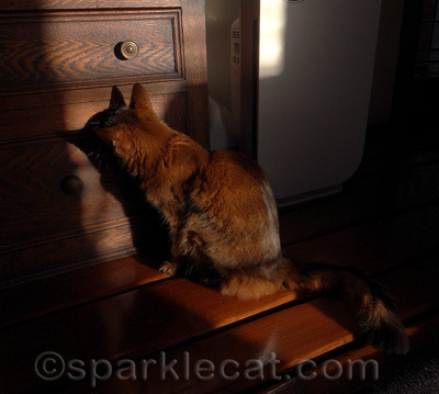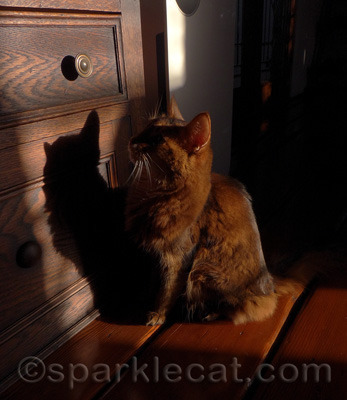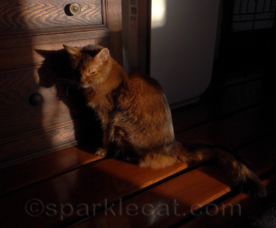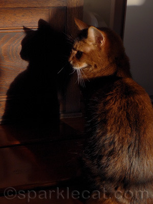 So… yes to the Chans, I came to live with my human as a kitten, and nope to Cathy Keisha, I was not a rescue. I came from a very small, but excellent Somali breeder from Temecula, California. My human usually doesn’t get breed cats, either as rescues or from breeders (Binga and Boodie are testament to that!), but after the cat before me died, she really wanted a cat who would be hers and hers alone. Binga (who came from a kill shelter) loves all humans equally, even if she hasn’t met them yet, and Boodie likes cats more than humans. So she decided if she found a cat breed with a trait that included bonding with one human, that’s what she would get. She always loved Abyssinians, but when she found out about Somalis — a longer-haired version of an Aby — and read that they generally bonded with one human, she was hooked. Unfortunately, it did not work out the way she thought, because she says I am bonded with her like a 13-year-old is with her mother — shunning her one moment and needy the next! Well, that’s what she gets.