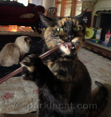 And especially Smidgen, who posed with the toy, the Knotty Spider! My human will have the Friskies humans send you the coupons!