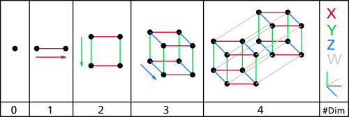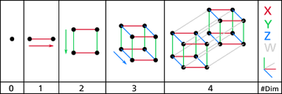 There is also the mathematical equation known as Euler's Formula. This formula, when applied to four-dimensional shapes, is V - E + F - C = 0 where V = number of vertices, E = number of edges, F = number of faces, and C = number of (3-dimensional) cells.Let's look at the hypercube:Vertices are points, so V = 16. Edges are lines. A cube has 12 lines, two cubes have 24 lines and then there are 8 additional lines connecting the two cubes, so E = 32. Faces are planes. These are easier to see if we render the hypercube in the following manner: