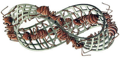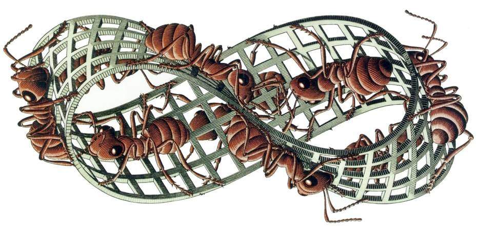 A sheet of paper is seen as a two-dimension plane, having only width and height. The same, naturally with a strip of paper. The strip of paper has two sides and four edges. When the two ends are joined with a half twist, the resulting object has one side and one edge. However, the left brain's method of understanding is to focus on individual features while ignoring the whole.
