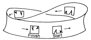 To get a clearer picture of what exactly Moebius was getting at, we must return to his strip and consider what happens to a two-dimensional citizen of Flatland as he moves around the band. Still, to be absolutely precise, the Flatlander doesn't actually move along the surface of the strip, rather the strip is an invisible membrane through which the Flatlander flows. So he is not so much on the strip and present on one side or other of the piece of paper, as he is moving within the invisible membrane of the strip which to him is the entire Universe. Anyway, when this Flatlander finally makes his way around the strip he returns to the point where he began but now he is upside-down.