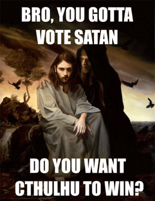 The event depicted in the meme has come to pass as the forces of Satan were vanquished by an even worse deity, Cthulhu.In the last election in the U.S. the choice was clear, Satan on the Left or Cthulhu on the Right. Satan stood for business as usual while Cthulhu represented the unleashing of the Kraken, releasing a force of pure chaos that sees humanity, if it perceives us at all, as an inconsequential form of life beneath consideration, except perhaps as a source of grease for lubricating the gears of time.Such a comparison seems overly melodramatic and lacking in any real world significance, but there is more to this matter than is apparent at first glance. Behind the Trump campaign was the mysterious Alt-Right movement whose member utilised both the symbolism and technology of Chaos Magick.Aleister Crowley is seen by many as the father of Chaos Magick. Consider his warning at the opening of his book Magick in Theory and Practice: