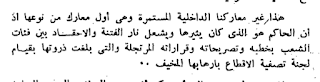 عن جمال عبد الناصر.هذا غير معاركنا الداخلية المستمرة وهي أول معارك من نوعها اذ أن الحاكم هو الذي كان يثيرها ويشعل نار الفتنة والاحقاد بين فئات الشعب بخطبه وتصريحاته وقراراته المرتجلة والتي بلغت ذروتها بقيام لجنة تصفية الاقطاع بإرهابها المخيف