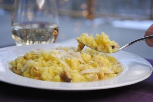 When you're finally done stirring and you taste the first bite, you can always tell a risotto that's been tended with care and love. I've made many different risottos in my life; and though I'm always eager to try new ingredients, my strawberry debacle haunts my culinary dreams, chastening any bold plans I might have. Thus, I often fall back on the timeless ingredients—seared shrimp, champagne, simple saffron—though my favorite is wild mushroom, made with dried mushrooms and saffron broth. But no matter the ingredients, I always try to model my father's techniques, both in the dish and with the guests.