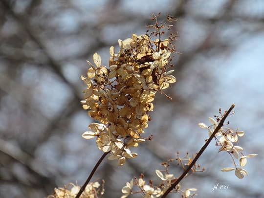 I’d been out there for an hour or more when sunshine on the hydrangea bush in our yard drew me to it. The angle was wrong (into the sun), and last year’s fragile blossoms were at the will of the wind. I stood still with my camera focused on the one that caught my eye, just in case.