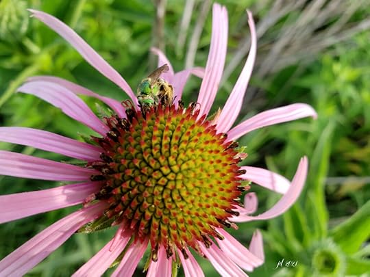 Near the other corner of the field, I saw a glimmer of green shining in the morning sun. An iridescent glimmer on a coneflower. It’s hard for me to resist this kind of sighting – something in me insisted I look closer.