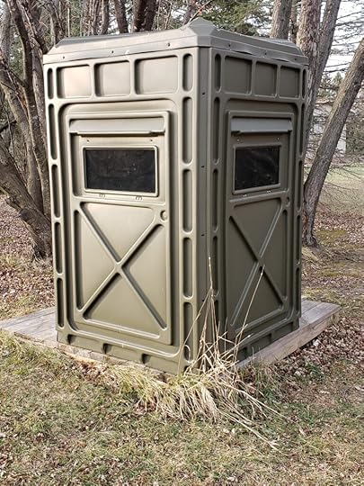 Not willing to disregard the advice of far more successful photographers than myself, we bought another hideout for out there. It reminds me of an army-green outhouse, but I was pretty sure it would discourage the woodpeckers, and it’s the best one yet against the wind.