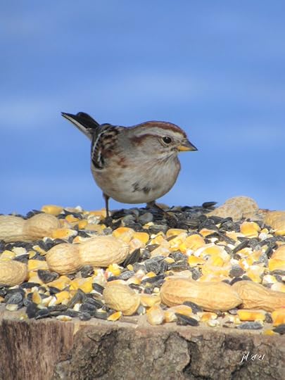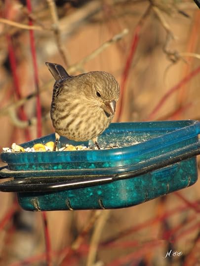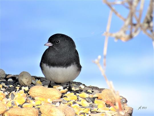 Their arrival startled me as they came in fast and a bit furious. Some arrived in a flurry of feathers and even the gentle juncos were feisty and flighty. I wondered if I had somehow carried the chaos of the human world into theirs. I hoped not. I shivered as the chilly wind circled around me and snuck into the space between my orange cap and my red jacket.