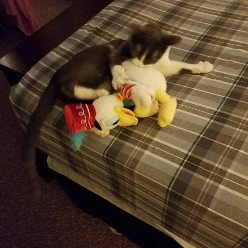 This is how my cat wants to ring in the new year: mauling Donald Duck.