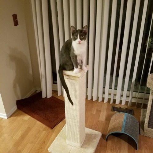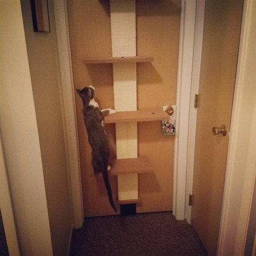 And viola. I was surprised Jasper jumped into the frame because he’s still wary of this new thing. I’ll have to go to Home Depot and pick up some shims to anchor it more tightly to the door. It shifts a little when he leaps on it, and I can tell it makes him nervous. (at Palatine, Illinois)