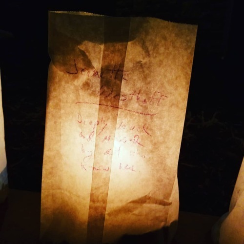 I attended a luminary memorial service this evening at Windridge cemetery. It was a beautiful ceremony, and I’m glad I went. Here is the luminary I made for Jeanette. It’s difficult to read because I wrote it in crayon (purple, of course), but here is what it says: “Jeanette Westhoff – Deeply loved and missed by all who knew her.” Next year I will know to use a purple marker. And to bring Grover stickers to decorate the bag. (at Windridge Memorial Park and Nature Sanctuary)