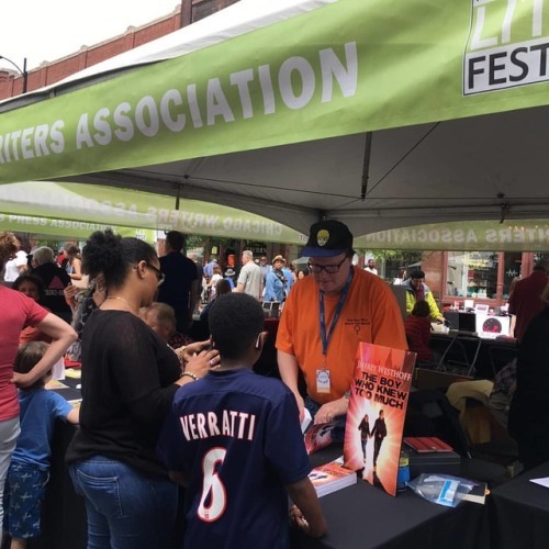 Look! It’s me, actually selling a book! I was at @printersrowfest yesterday and I had a good day. I sold five books! I know that doesn’t sound like many, but it’s pretty good for this type of event. #TheBoyWhoKnewTooMuch (at Printers Row Lit Fest)