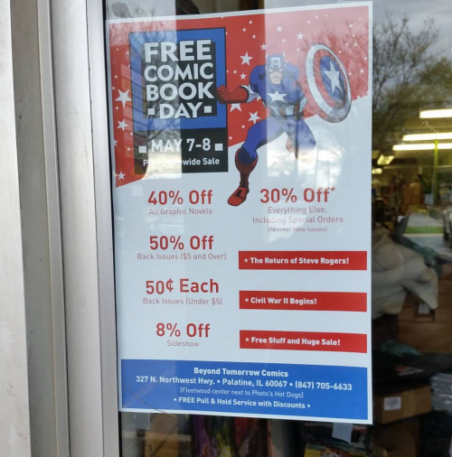 If you’re in Chicago’s northwest suburbs, celebate #freecomicbookday this weekend at Palatine’s Beyond Tomorrow Comics. Dave has a big sale planned, and lots of free comics, of course. (at Beyond Tomorrow Comics)