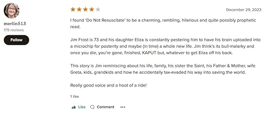 Thank you to everyone who has taken the chance on an indie author. Do Not Resuscitate has earned 4.1 stars on Amazon thanks to 184 reviewers.
