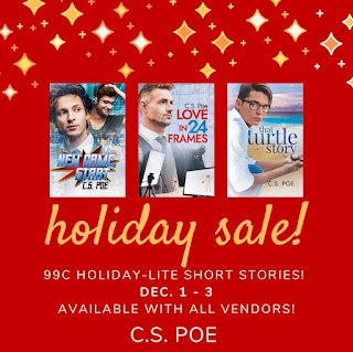 Three holiday-lite short stories by C.S. Poe are on sale for only 99 cents, now through December 3rd. Pick up a copy of New Game, Start , Love in 24 Frames , and That Turtle Story at all online vendors, including my Payhip store!