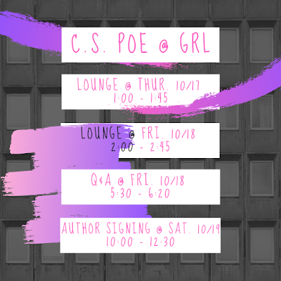 GRL is fast approaching! C.S. Poe will be at the event from Oct. 15 - 20, with official pre-retreat events beginning on the 16th. My author attendances are where you will 100% find me, but if you're looking to hang out in a more relaxed atmosphere, you'll always be able to find me at the nightly parties or hotel bar. I promise I'm easily approachable and very talkative!Thursday, 10/17